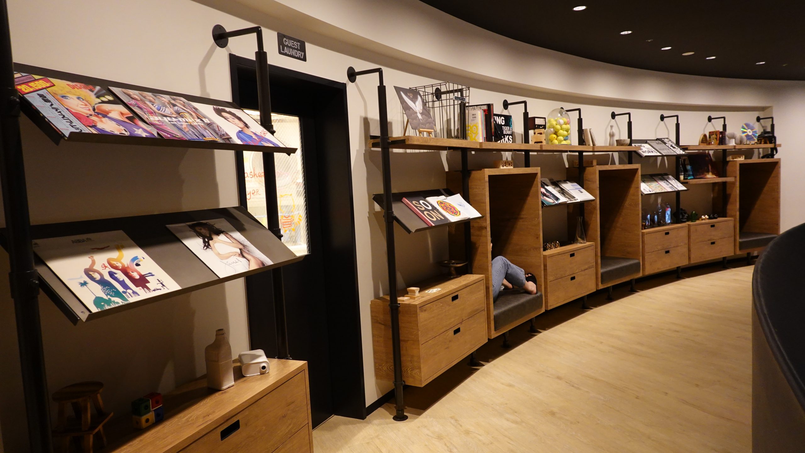 ランドリールームはライブラリーコーナーの並びにあるので、ここで時間を潰すのもOK、丁度すっぽりはまっている人が写真に写っていますが、落ち着いて本を読んだりできそうです。
